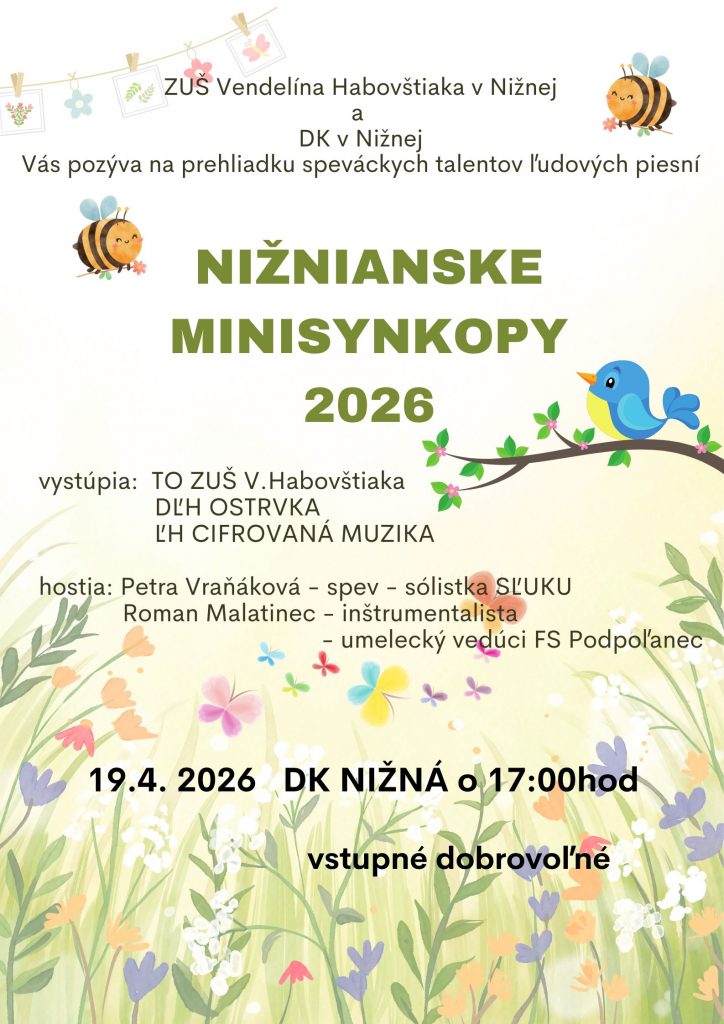 Nižnianske minisynkopy 2026 7. apríla 2026 kortman Aktuality, hot 0 Pozývame Vás na prehliadku speváckych talentov Nižnianske minisynkopy 2026. Vytlačiť stránku cifrovanamuzikaminisynkopyostrvkaspevto